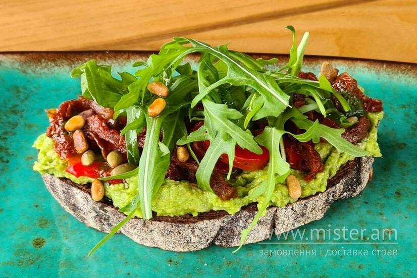 Темний тост, авокадо, кедровий горіх, рукола, насіння гарбуза, болгарський перець, в`ялені томати, соус песто, спеції.