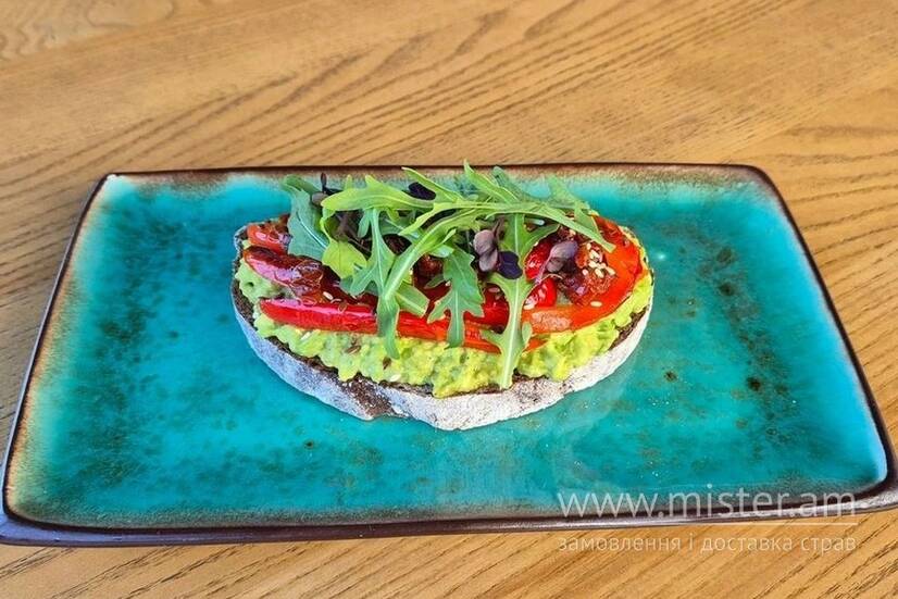 Темний тост, авокадо, рукола, насіння гарбуза, болгарський перець, в`ялені томати, соус песто, спеції.