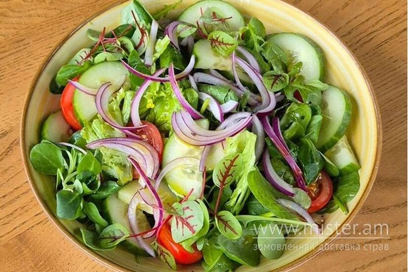 Мікс салату, огірки, помідори, синя цибуля, оливкова олія.