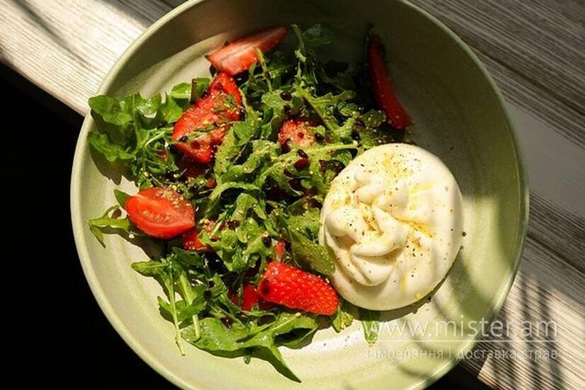 Салат з буратою, руколою та сезонними ягодами