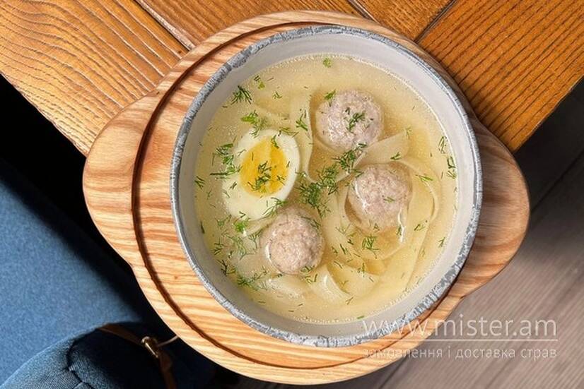 Легкий бульйон з локшиною та половинкою курячого яйця.