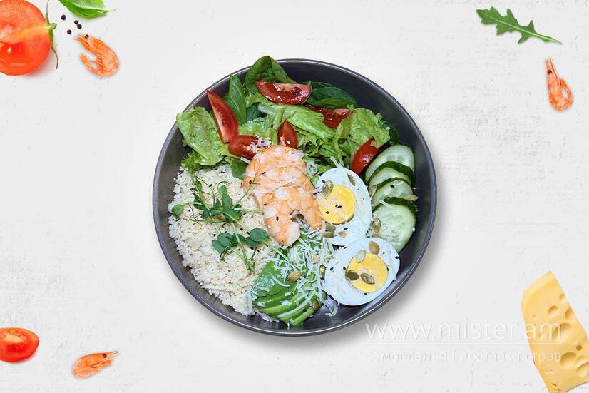 Кус кус, тигрова креветка, мікс зелені, авокадо, помідор чері, огірок, яйце варене, пармезан, гарбузове насіння, кунжут, мікрогрін.