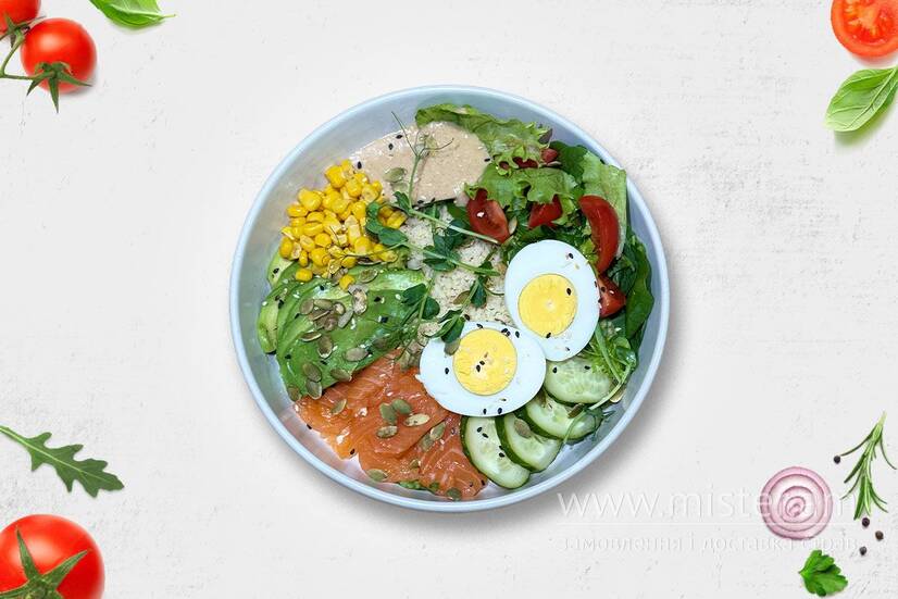 Кус кус, лосось, мікс зелені, помідор чері, авокадо, огірок, кукурудза, яйце варене, горіховий соус, гарбузове насіння, кунжут, мікрогрін.