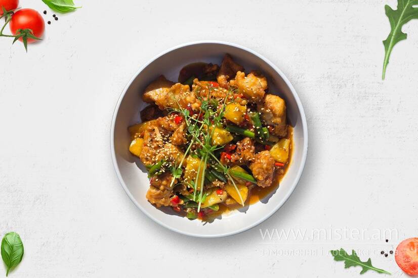 Філе курки, соус теріякі, спаржа, червоний перець, ананас.