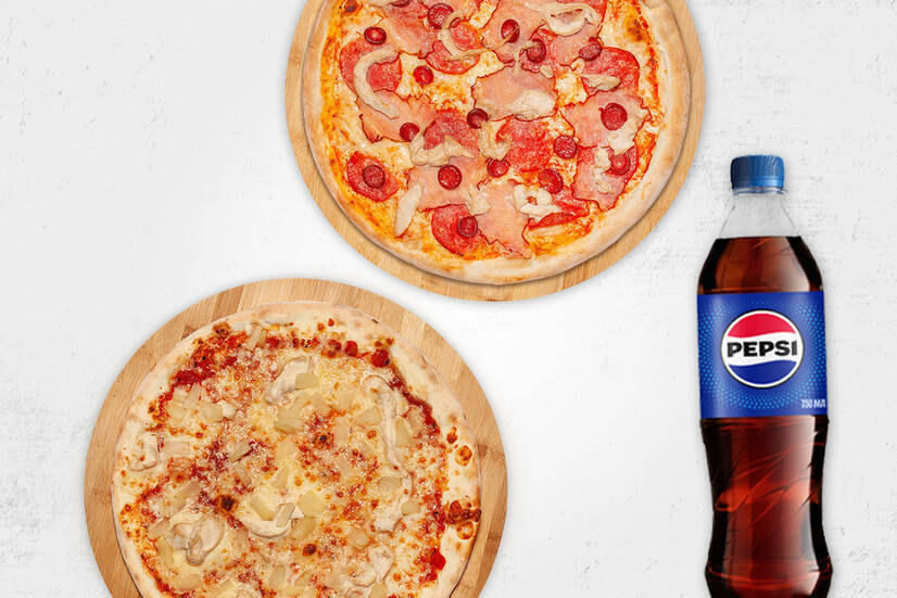 До набору входить: піца "Гавайська" 30см, піца "4 м'яса" 30см, Pepsi 0,75л.
