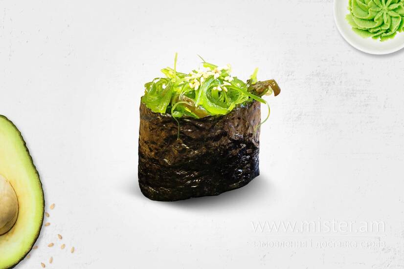 Рис, норі, соус горіховий, водорості хіяші, кунжут.