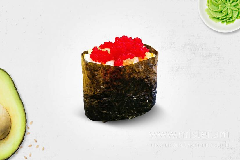 Рис, норі, тигрова креветка, соус манго-чілі, ікра тобіко.