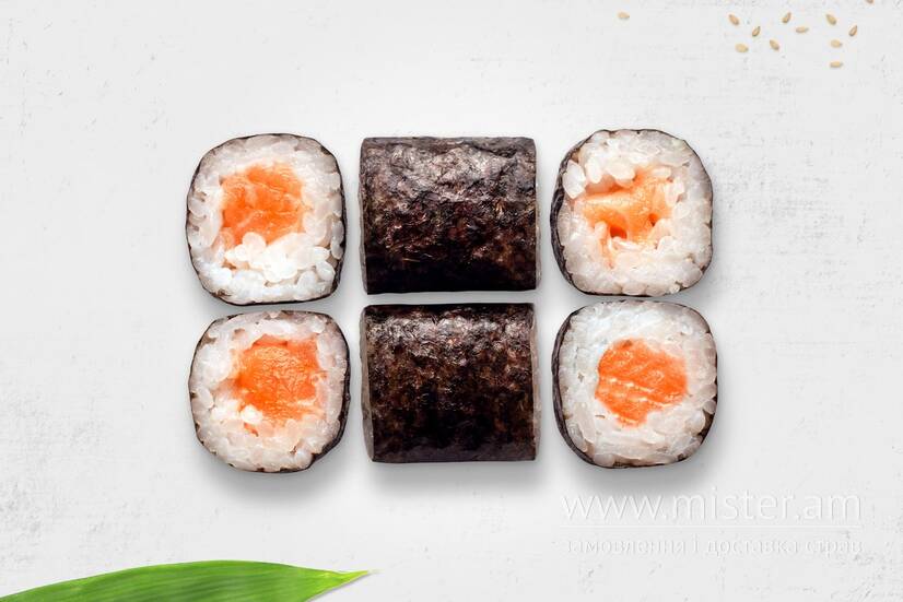 Рис, норі, свіжий лосось. До ролів додаються палички, соєвий соус, імбир та васабі.
