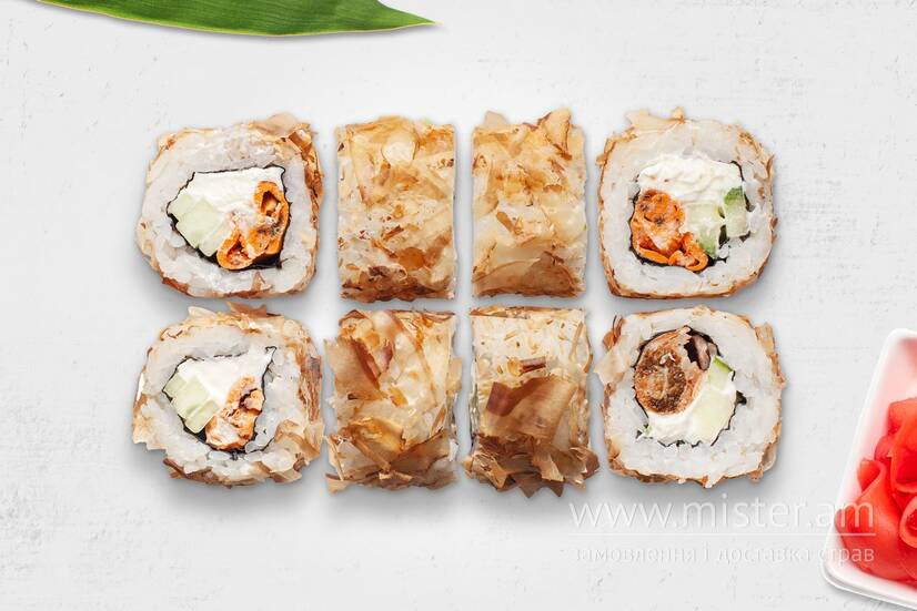 Рис, норі, крем-сир Філадельфія, огірок, мідії, стружка тунця. До ролів додаються палички, соєвий соус, імбир та васабі.