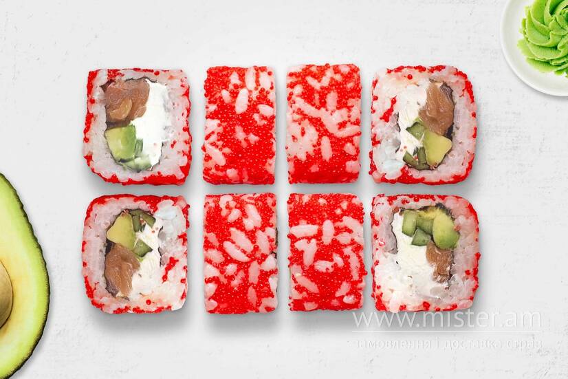 Рис, норі, крем-сир Філадельфія, огірок, авокадо, ікра тобіко, лосось. До ролів додаються палички, соєвий соус, імбир та васабі.