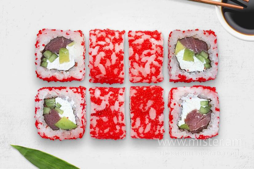 Рис, норі, крем-сир Фладельфія, огірок, авокадо, ікра тобіко, тунець філе. До ролів додаються палички, соєвий соус, імбир та васабі.