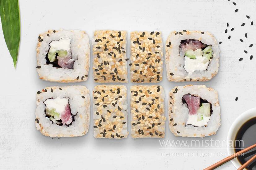 Рис, норі, крем-сир Філадельфія, огірок, тунець філе, кунжут. До ролів додаються палички, соєвий соус, імбир та васабі.