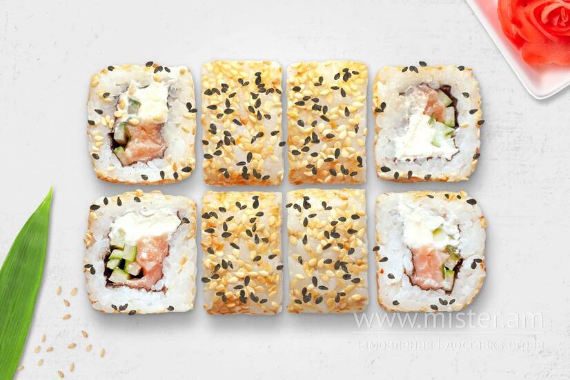 Рис, норі, крем-сир Філадельфія, огірок, лосось, кунжут. До ролів додаються палички, соєвий соус, імбир та васабі.