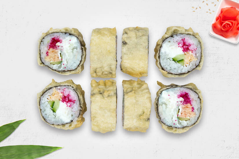 Рис, норі, крем-сир Філадельфія, лосось, огірок, ікра тобіко, темпура. До ролів додаються палички, соєвий соус, імбир та васабі.