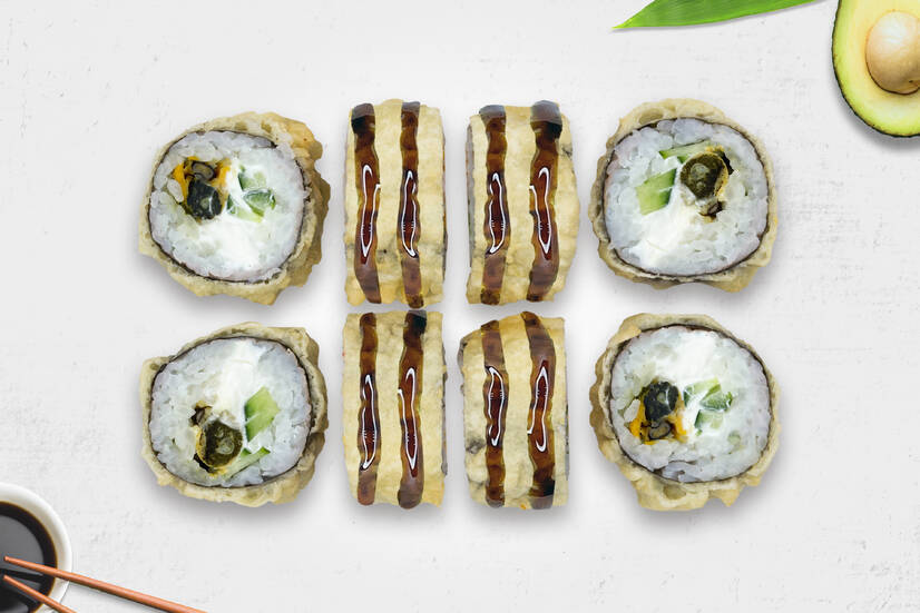 Рис, норі, крем-сир Філадельфія, мідії, огірок, темпура, соус унагі. До ролів додаються палички, соєвий соус, імбир та васабі.
