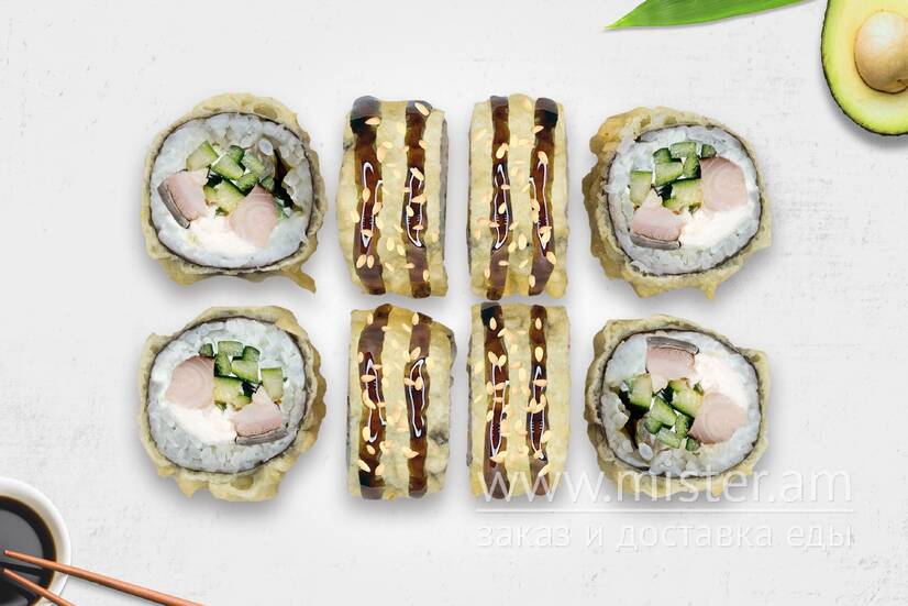 Рис, норі, крем-сир Філадельфія, огірок, вугор, темпура, соус унагі, кунжут. До ролів додаються палички, соєвий соус, імбир та васабі.