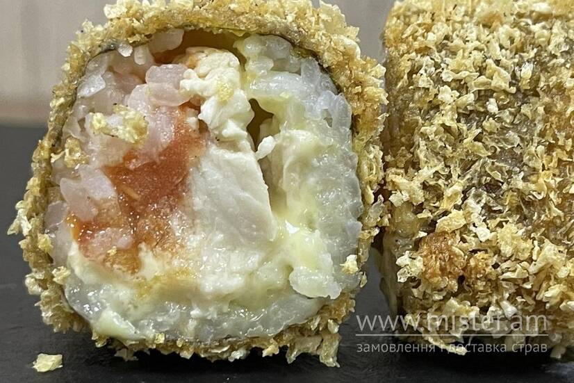 Норі, рис, сир чедер, курочка, помідор, паніровка.