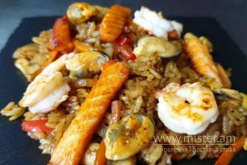 Рис тяхан, перець болгарський, морква, цибуля, гриби, лосось, мідії, тигрова креветка, соус кабаякі, кунжут смажений.