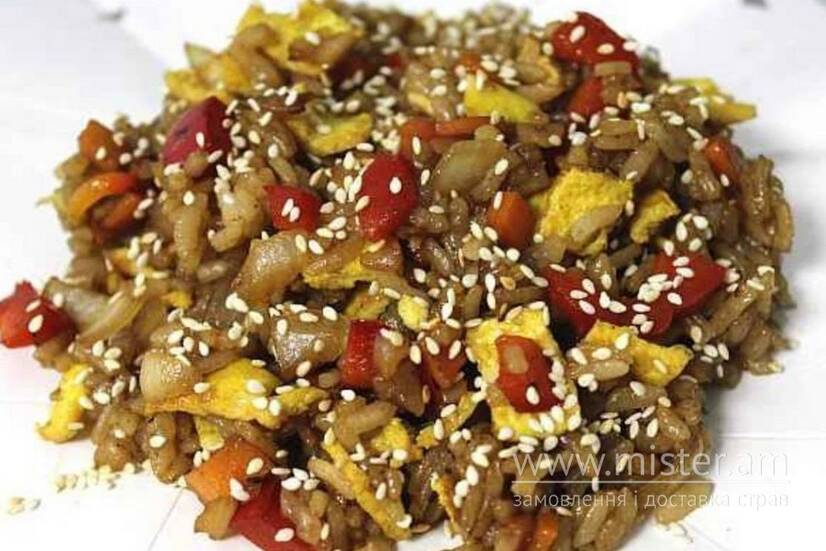 Рис тяхан, перець болгарський, морква, цибуля, гриби, соус кабаякі, кунжут смажений.