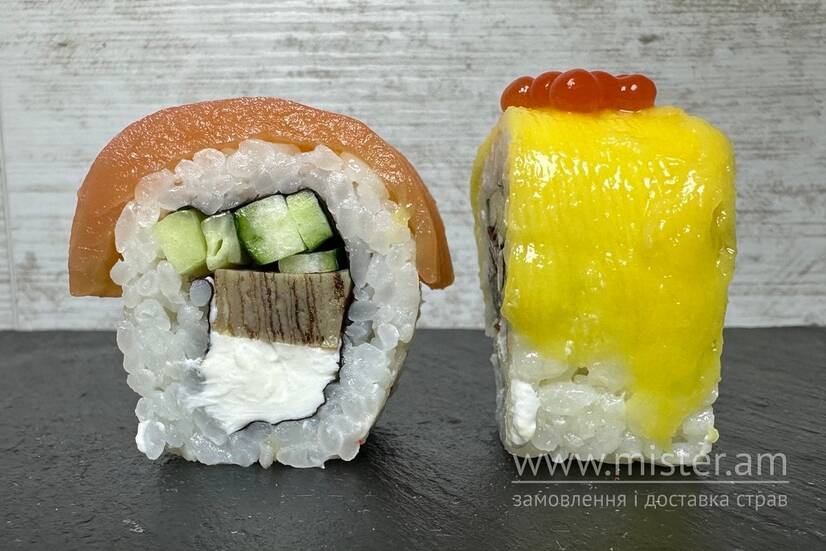 Норі, рис, сир Філадельфія, омлет Томаго, огірок, лосось, манго, соус унагі.