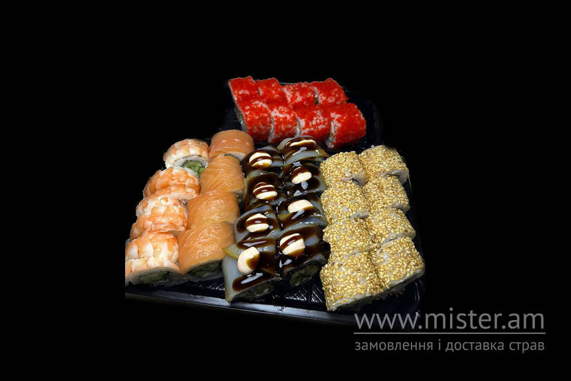 Сніжний краб в кунжуті, Філадельфія мідії в ікрі, Філадельфія black сезам, Філадельфія оригінал - Тигровий рол 1/2. Палички – 2 пари, соєвий – 80 г, імбир – 40 г, васабі – 20 г, унагі – 40 г.