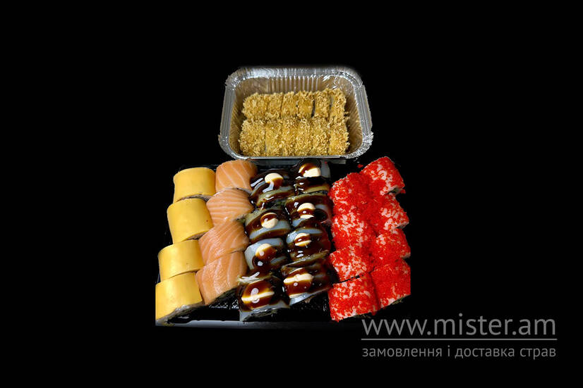 Філадельфія Black сезам, Філадельфія чіз, Каліфорнія мідії в ікрі, Гарячий рол з крабом. Палички – 2 пари, соєвий – 80 г, імбир – 40 г, васабі – 20 г.