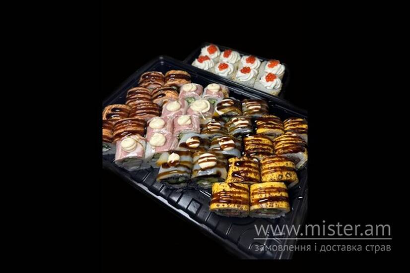 Філадельфія оригінал гриль, Чіз лосось гриль, Філадельфія Black сезам, А-ля філадельфія з мідією, Хентай. Палички – 2 пари, соєвий – 80 г, імбир – 40 г, васабі – 20 г.