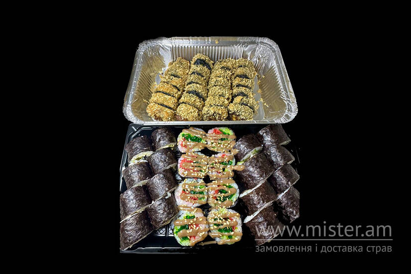 Макі хіяші, макі з мідіями, макі з лососем, гарячий рол з креветкою, гарячий рол з вугрем. Палички – 2 пари, соєвий – 80 г, імбир – 40 г, васабі – 20 г, унагі - 40 г.