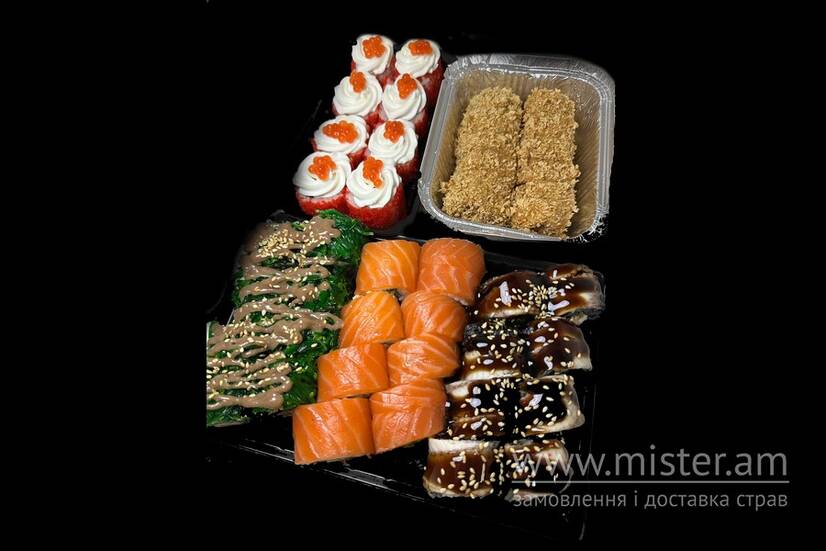 Сакура, Філадельфія оригінал, Bankai, Чорний дракон, Гарячий краб. Палички – 2 пари, соєвий – 80 г, імбир – 20 г, васабі – 20 г, унагі – 15 г.