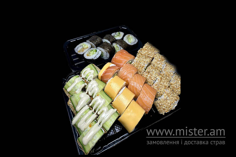 Рол мідії, Сніжний краб в кунжуті, Філадельфія чіз, макі з кальмаром. Палички – 2 пари, соєвий – 80 г, імбир – 40 г, васабі – 20 г.