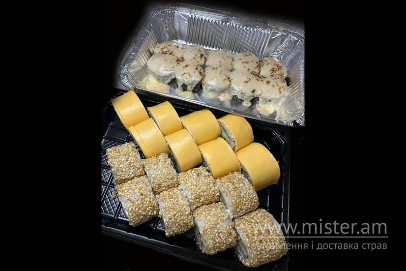 Запечена курочка, Чіз томаго, Філадельфія в кунжуті гриль. Палички – 2 пари, соєвий – 80 г, імбир – 40 г, васабі – 20 г, унагі – 40 г.