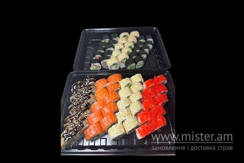 Філадельфія оригінал, Унагі бум, Кальмар в кунжуті, Каліфорнія мідії в ікрі, макі огірок, Сніжний краб, Баварський спайс. Палички 4 шт., соєвий соус 160 г, імбир 80 г, васабі 40 г.