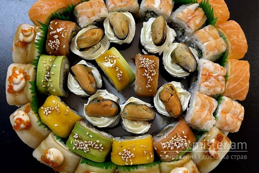 Чіз лосось, Тигровий рол, Білий дракон, Капа мідії, Тропік. Палички – 2 пари, соєвий – 40 г, імбир – 40 г, васабі – 20 г.
