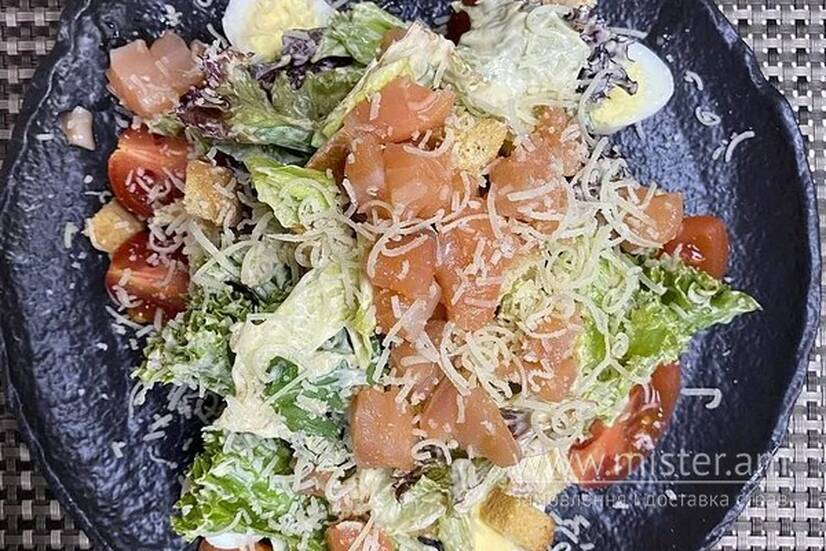 Мікс салат, лосось, яйця перепелині, пармезан, томати чері, сухарики.