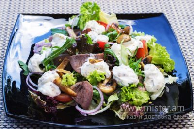 Мікс салат, язик, помідор, гриби, цибуля.