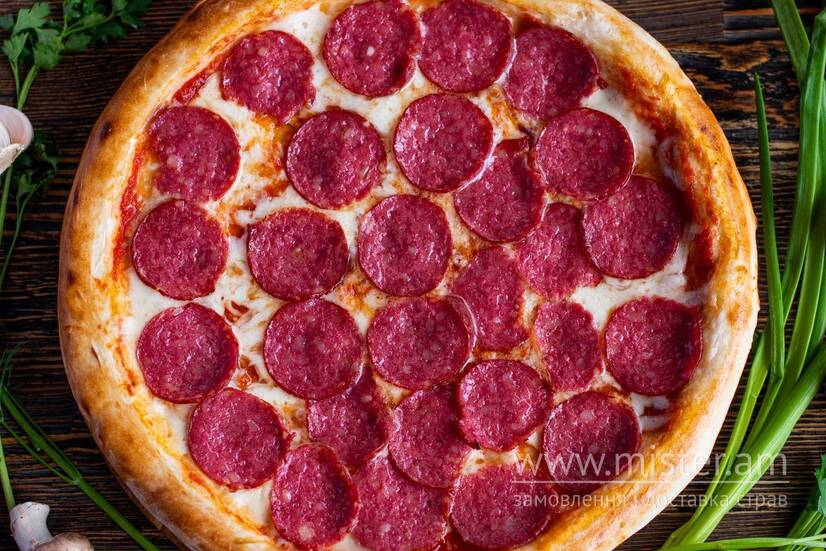 Соус на основі томатів пелаті, сир моцарела, багацько салямі.