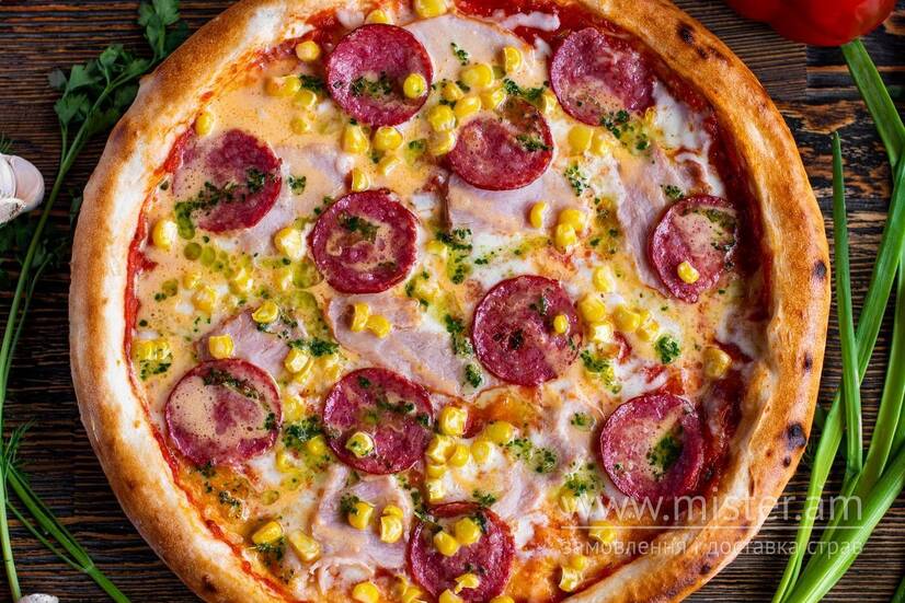 Соус на основі томатів пелаті, сир моцарела, шинка, салямі, зерна кукурудзи, сирний соус, зелена олія.