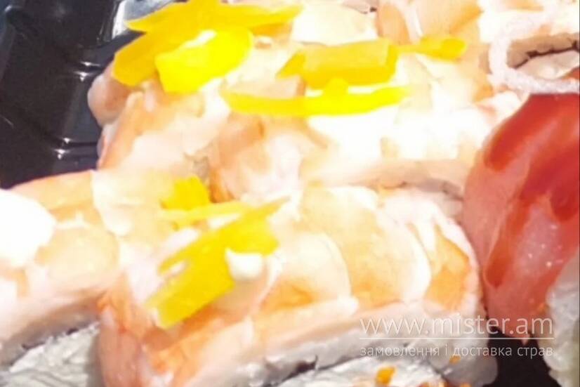Рис, крем-сир, лосось, креветка, норі,ікра масаго, авокадо, манго сушене, майонез.