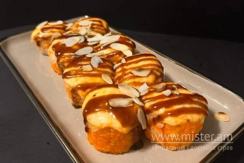 Тигрова креветка, Філадельфія, манго, ікра масаго, гауда, пармезан, мигдаль, унагі, рис, норі.