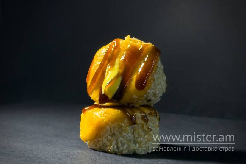 Рис, крем-сир, курка, ананас, гауда, пармезан, майонез, ікра масаго, норі, кунжут, сирний соус.