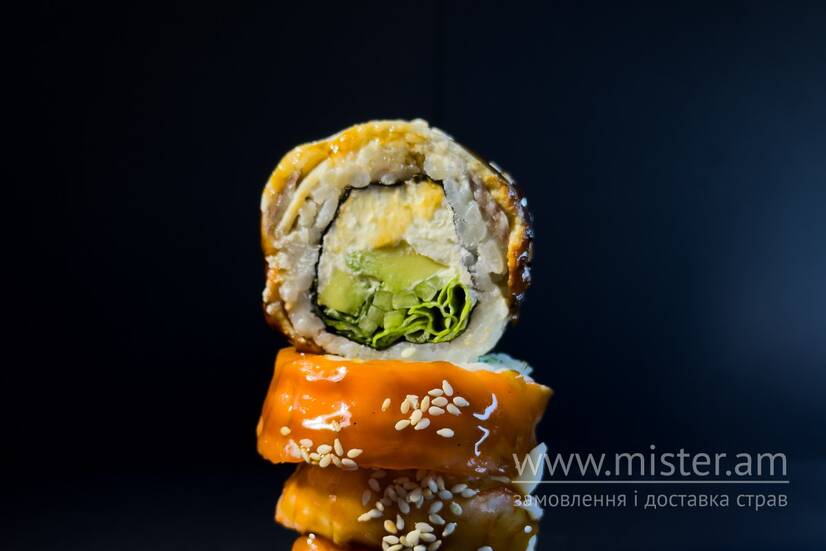 Рис, крем-сир, авокадо, тунець, огірок, норі, унагі, манго сушене.