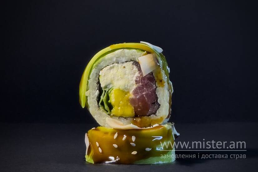 Рис, крем-сир, тунець, манго, айсберг, норі, авокадо, унагі, кокосові чіпси.