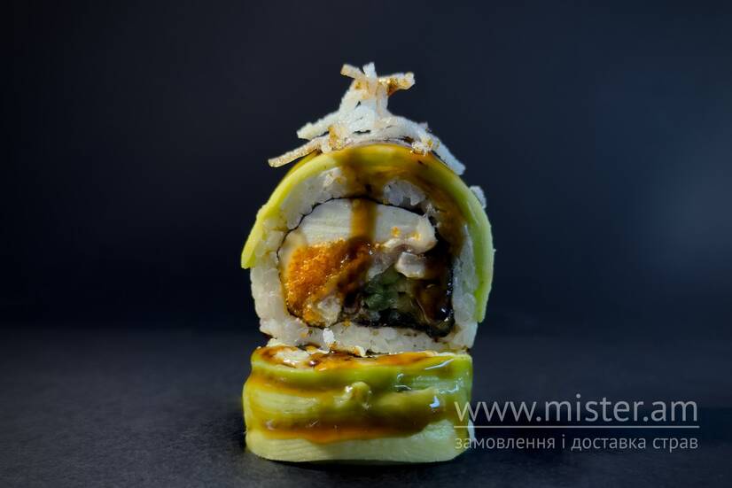 Рис, крем-сир, ікра масаго, вугор, авокадо, огірок, норі, унагі, фунчоза.