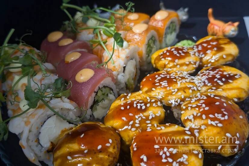 Макі з лососем, макі з тунцем, макі з копченим лососем, макі з манго, макі з авокадо, макі з огірком.