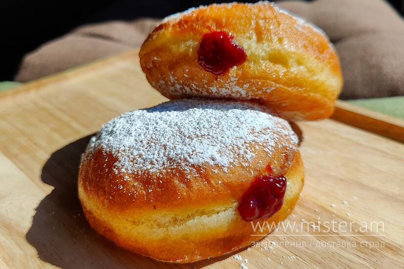Дріжджове тісто смажене у фритюрі, начинка вишневе конфі.