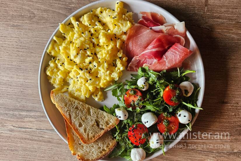 Скрамбл, рукола, міні-моцачера, чері, хамон, хліб.
