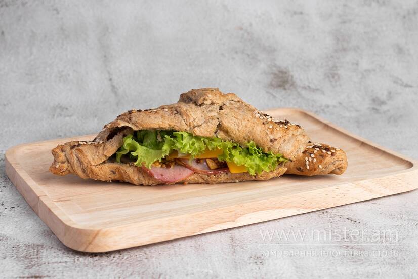 Зерновий круасан на маслі, вершковий сир, шинка, французька гірчиця, сир тостовий, листя салату.