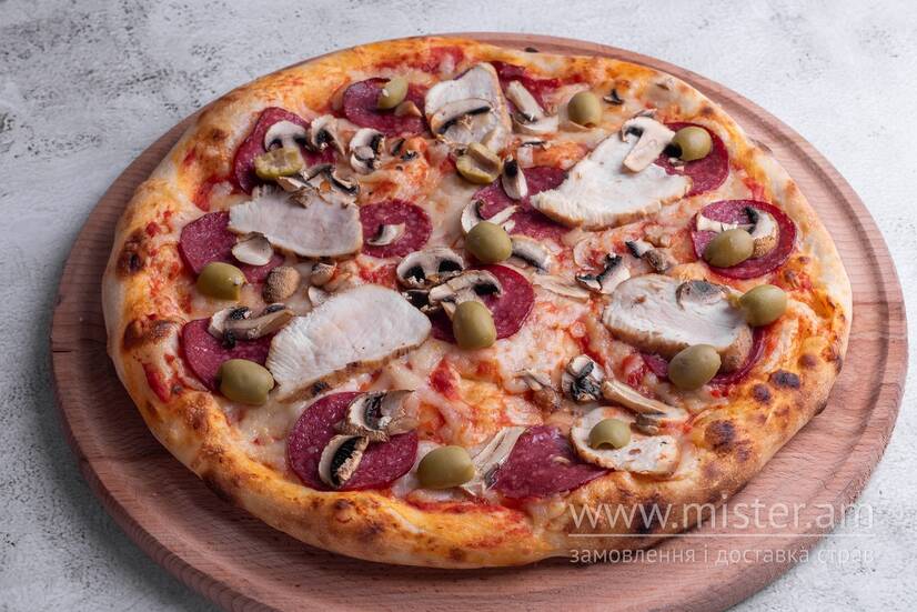 Соус пелаті, моцарела, салямі, куряче філе, печериці, оливки.