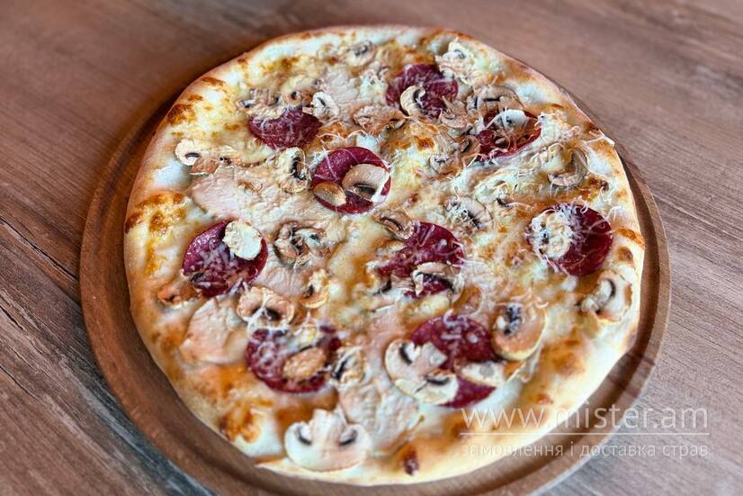 Основа на вершково-часниковому соусі, моцарела, куряче філе, салямі, печериці, пармезан.
