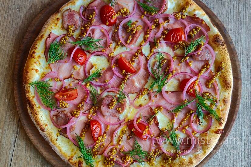 Соус часниково-вершковий, моцарела, домашня ковбаска та буженинка, маринована цибуля, чері, гірчиця в зернах, кріп.